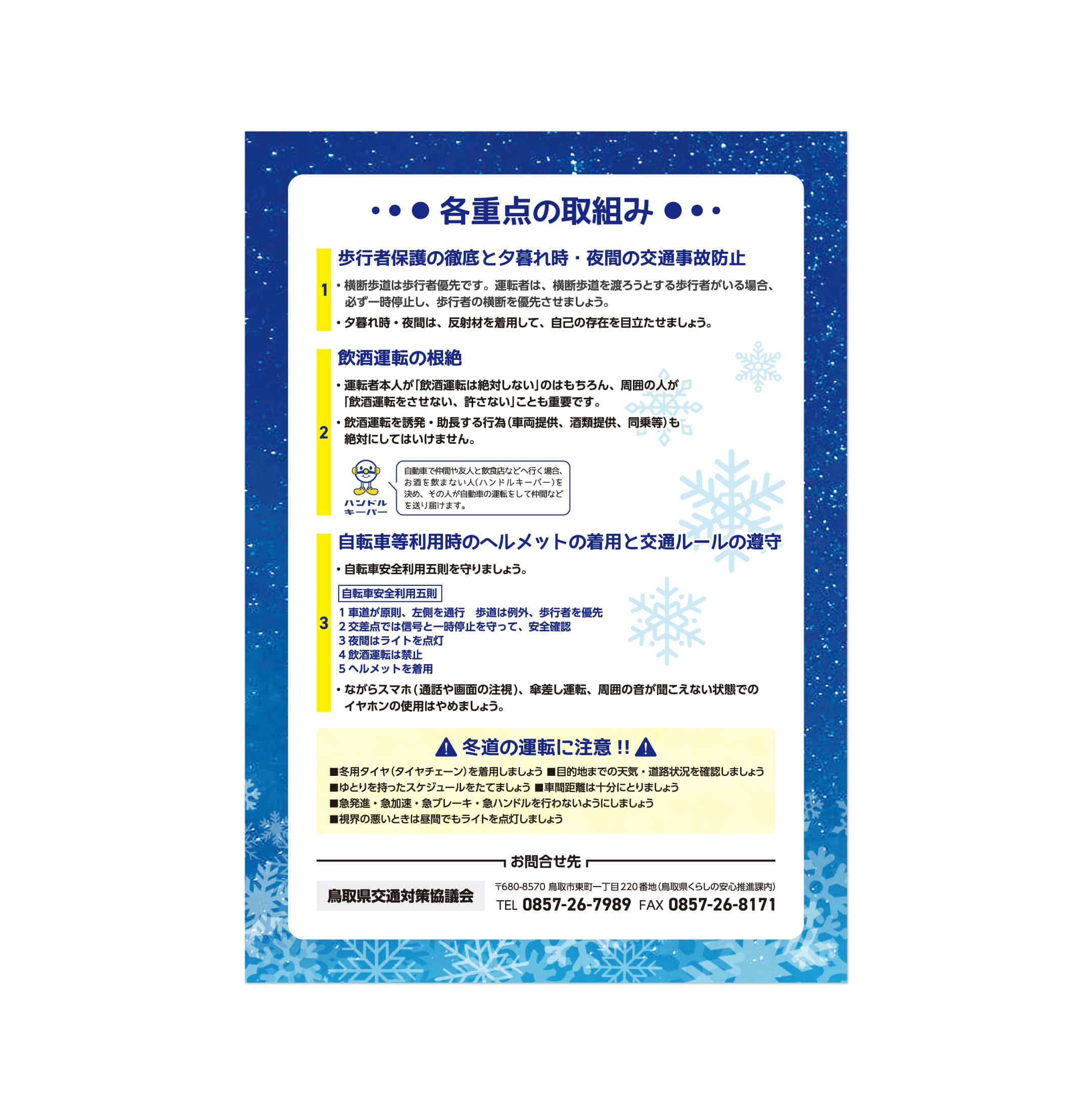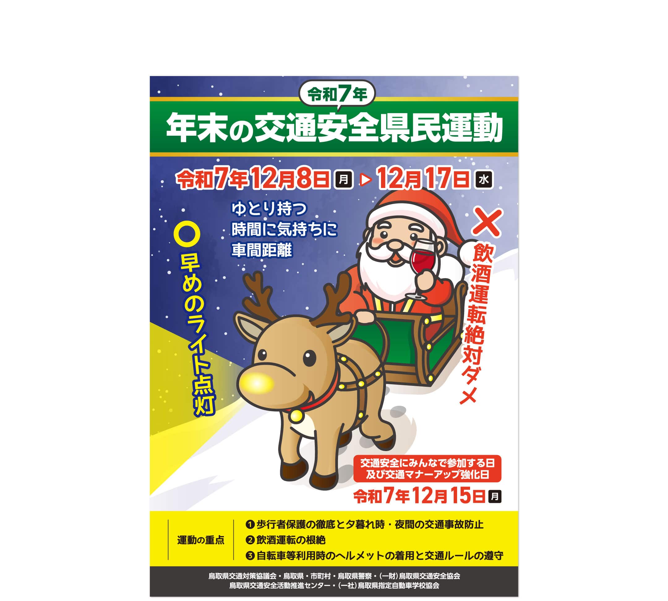 Works 制作実績 Marblemode Home > works > 鳥取県交通対策協議会様年末の交通安全県民運動A4チラシ graphic VI・CI package web movie others 鳥取県交通対策協議会様年末の交通安全県民運動A4チラシ クライント:鳥取県交通対策協議会様 2025